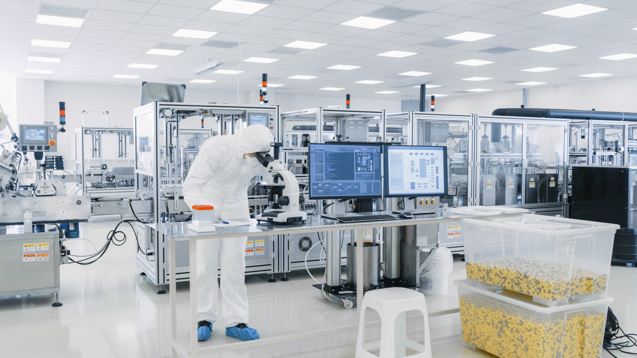 Shot of Sterile Pharmaceutical Manufacturing Laboratory where Scientists in Protective Coverall’s Do Research, Quality Control and Work on the Discovery of new Medicine. Share Share on LinkedIn Email this Page ByGeoff Finstuen