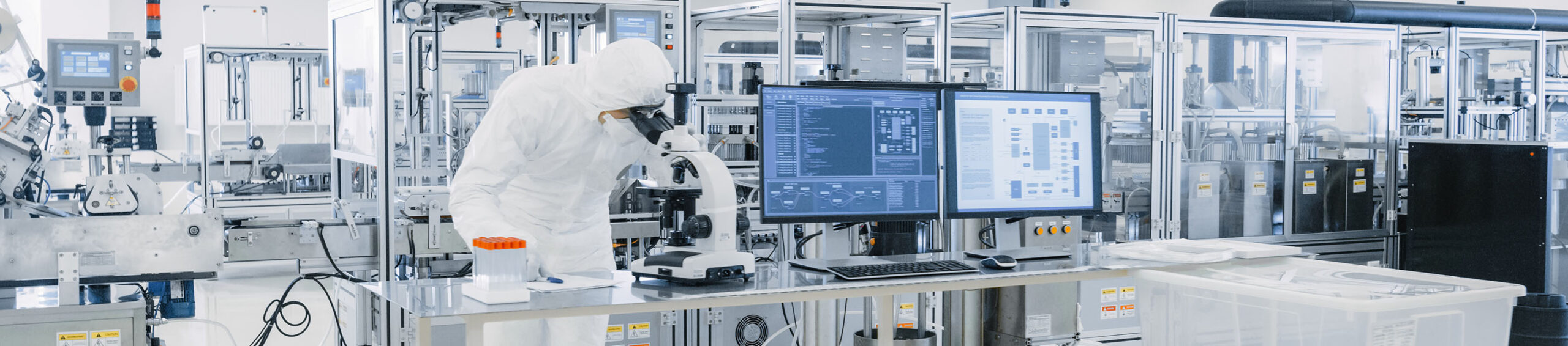 Shot of Sterile Pharmaceutical Manufacturing Laboratory where Scientists in Protective Coverall’s Do Research, Quality Control and Work on the Discovery of new Medicine.